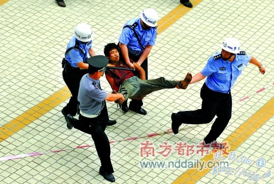 中午11时50分许,在警察的“围攻”中,一名警员将“犀利哥”的匕首夺去,其他警员顺势将其按倒在地。一名警员在制服过程中摔倒擦伤。“犀利哥”被押上警车时对记者说,他是高州人,28岁。而车站保安、拉客仔及小吃摊主均称之前未见过此人。