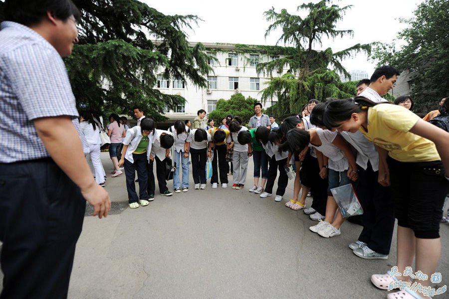 6月9日上午11点,山东高考结束,在山东省实验中学考点,走出考场的考生集体鞠躬谢师恩,共同庆祝高考结束。