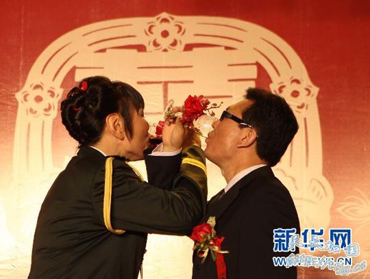 郑海霞(左)和新郎徐庆华喝交杯酒