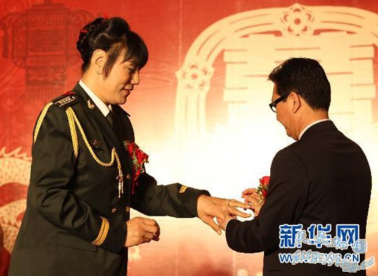 今天郑海霞婚礼上并没有穿婚纱,而是身穿军装亮相,他的先生则是一身西装。婚礼上司仪别心出裁用画记录了两人相识相爱的经过。在亲友的起哄下,郑海霞与新郎进行了喝交杯酒、接吻等“传统”婚礼仪式。