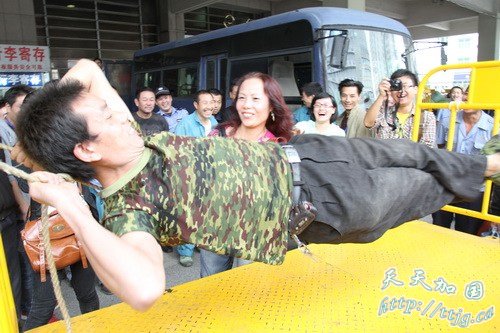 记者昨日在城站托运处苦等六小时,终于看到忙完的傅洪师傅走出卸货区。在记者的要求下,傅师傅现场展示睡绳绝技,顿时引得众多路人围观。