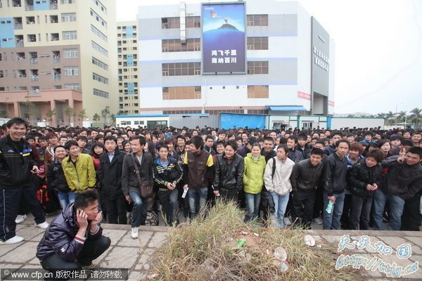 从大年初四(2011年2月6日)开始,深圳龙华富士康门口求职人数一天比一天多,到2011年2月14日,每天都有万余人排队求职。排队人群占据马路,甚至站到路边荒草堆上。