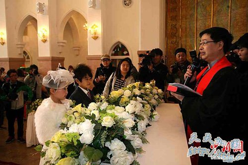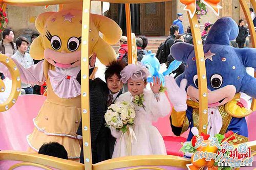 4 月1日,辽宁大连,23岁身高1.28米的“拇指姑娘”朱洁与同样个子的男生秦学仕举行了浪漫的童话婚礼。当日,在发现王国主题公园的春季新开园仪式上,朱洁装扮成美丽的小公主,与男友秦学仕乘坐南瓜马车进入婚礼殿堂。盛大的巡游队伍配合着公园极富梦幻色彩的建筑环境,整个婚礼过程让人犹如置身于童话世界。