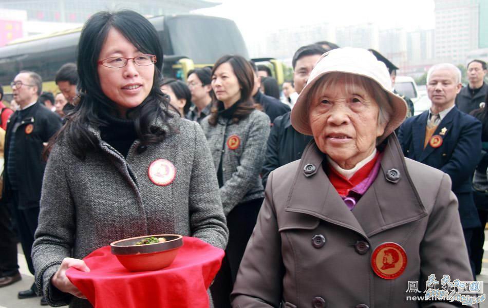 4月4日,毛泽东少年时期的邻居、年逾80的汤瑞仁老人(右)带上主席最爱吃的家乡红烧肉启程前往北京。当天,来自社会各届的99名湖湘儿女代表搭乘专机进京祭奠毛泽东。清明节当天,他们将在毛主席纪念堂举行缅怀活动,表达家乡人民对毛泽东的思念和崇敬之情。