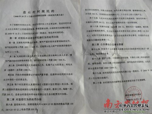 2008年10月1日,在召开了“第四届第一次”村民代表大会后,盘石村出台了一份《村规民约》。这部“乡村宪法”共分为四个部分,即“对扰乱社会治安和乱婚行为的处罚办法”、“对盗窃行为的处罚办法”、“对破坏农业生产的处罚办法”和“公共事业公益事业管理”。在共计20条规定中,涉及罚款或收费的有16条,罚款金额5到5000元不等,事项涉及破坏公共秩序、通奸、盗窃、偷杉木、牛羊吃(别人家)蔬菜、鸡鸭吃(别人家)谷子等方面,内容十分详尽。