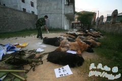 死亡的29只名犬中藏獒就有8只 工作人员给死亡的狗身上撒石灰消毒 服用的驱虫药 中新网柳州8月5日电 广西柳州一家保安公司警犬基地的28只警犬在服用一种名叫硝氯...