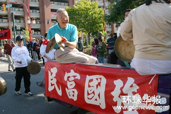 在上周日(9月27日)温哥华华埠的大巡游中,华裔民众打出“民富国强”的祝福字句。 黄运荣 摄