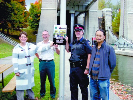 麦克林警长(右2)和马振光(右1)5日联同加拿大公园管理局以及灭罪热线的代表,一同推出宣传标牌。(照片由马振光提供)