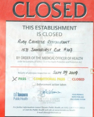 不久前刚刚接待过华人社团庆祝中国建国六十年活动的士嘉堡红宝石酒楼发生怀疑食客进食含有沙门氏菌食物后中毒事件,多伦多卫生局7日正式向酒楼发出红牌,勒令酒楼暂停营业,当局证实三人需要送院,18宗怀疑个案,其中一名老翁死亡,目前正在调查其死因是否与沙门氏菌有关。当局不排除曾受感染的人会更多。多市副卫生督察Howard Shapiro表示,虽然酒楼有两日时间大扫除,但未能符合恢復营业所需的要求,在下次检查之前酒楼会继续关闭。