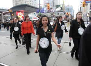这些人离开央街-登打士广场(Yonge-Dundas Square)是发出仿似秒钟运行的滴答声,引来了途人疑惑的目光。
