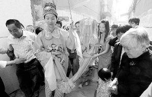 新郎在伴娘的帮助下,将新娘缓缓地从轿子中请出,“跨火盆”、“过马鞍”、“拜天地”,终于将自己的美娇娘迎入洞房。在婚礼现场,记者看到,整场婚礼程序完全遵循传统婚礼形式。