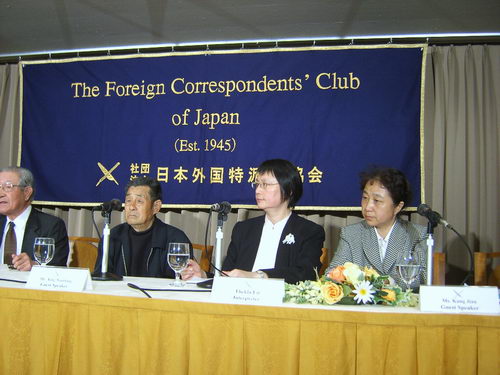 中国劳工受害人代表律师康健(右一)及史维会列国远(右二)支持劳工受害人向日政府及有关企业索赔,2007年时在日本外国记者会所举行新闻发佈会,督促日本面对罪责。