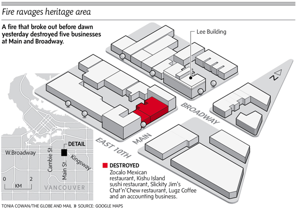 一场大火烧毁了温哥华Main街和Broadway十字路口附近的一些商业建筑,火苗窜入空中十米高,烧毁了电力设备,并造成几个街区交通堵塞。