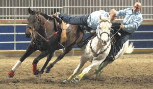 魁省Pony Express成员在农业展中表演交换奔驰坐骑绝技。