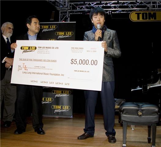 郎朗在接受通利琴行总裁李敬成的五千元支票后表示感谢,他说郎朗国际音乐基金会旨在帮助及扶植全球有天份的钢琴学生成才,现在已有五名5至8岁的学生受益于此计划。