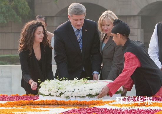 11月17日,新德里,总理哈珀和妻子向圣雄甘地墓地敬献花圈。
