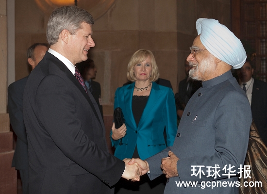 11月17日,新德里,总理哈珀和妻子Laureen,与印度总理辛格(Dr. Manmohan Singh)话别。