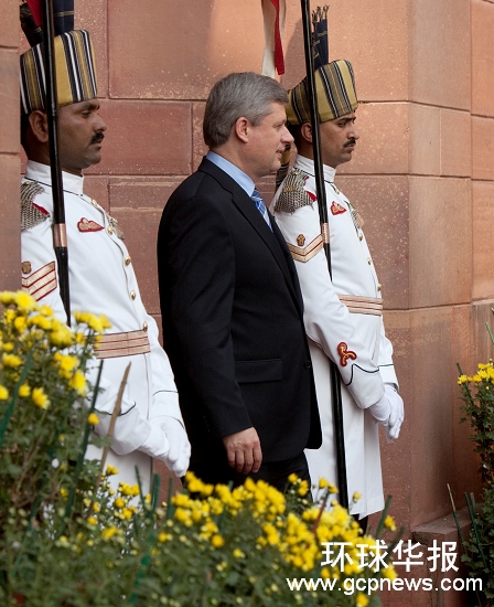 11月17日,新德里,哈珀总理在同印度总统普拉蒂巴·帕蒂尔会晤后离开印度总统府。