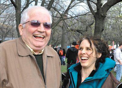 上图:创造世界闻名的感染性大笑的笑声大师科林斯(左,Doug Collins),有一次与多伦多发笑谘询师暨教练菲布柯(Jennifer Philbrook)在一起发笑示范。