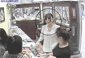 第二名女疑匪(黑圈者)怀疑进入珠宝店内为同党解围,并涉嫌以假身份证及假卡购下首饰。