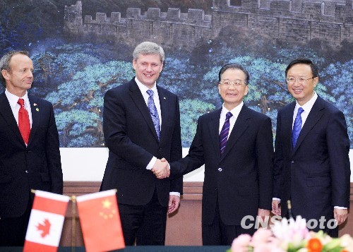 中国总理温家宝三日下午在人民大会堂同加拿大总理哈珀举行会谈,双方表示要致力于进一步推进中加战略伙伴关系