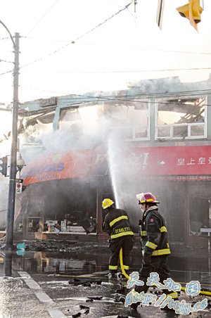 温哥华百老汇东街(E. Broadway)同京士威大道(Kingsway)路口一幢两层高旧商业建筑,圣诞日凌晨发生三级火,烧毁逾20家店铺,最少两家华裔餐馆受波及,幸无人命伤亡。