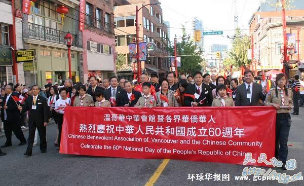 全加各地华人庆祝中华人民共和国成立60周年活动丰富多采。9月27日,温哥华华埠街头红旗飘扬,锣鼓喧天,大温地区侨界举行盛大中国国庆巡游活动,数万名市民参加。侨团及各界代表当晚再欢聚一堂,举行千人联欢晚宴。在多伦多,有80个社团,近8000人参加游行,在省议会大楼前草地举办升旗议式。渥太华华侨华人及留学生400多人在渥太华市中心的国会山前举行集会。阿省卡城华人社区逾90个社团及商业单位,10月1日举办晚宴,逾600位嘉宾出席,包括亚省省督林佐民伉俪。