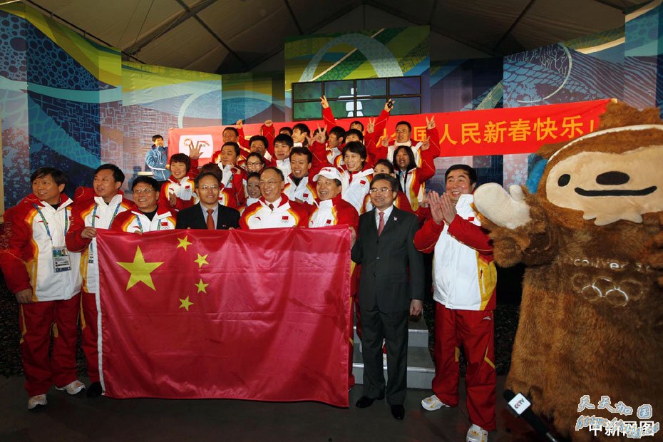 中国冬奥代表团在升旗仪式结束后,展开横幅高声向全体国人送上新春祝福