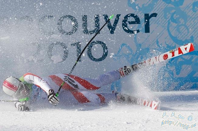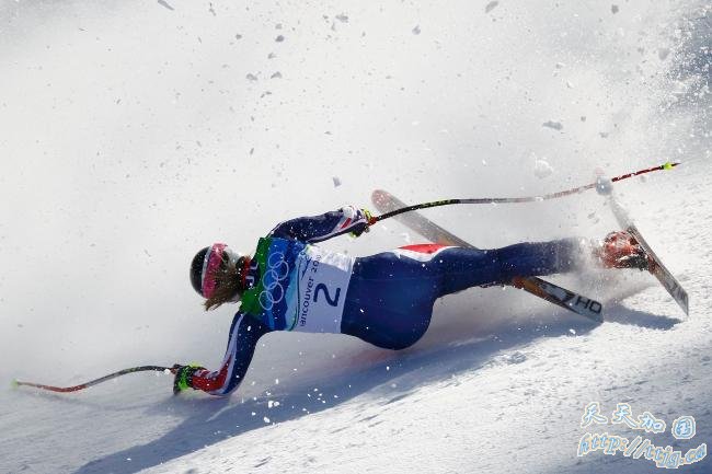 在女子速降滑雪赛中,奥地利选手安德丽亚·费奇巴彻尔摔倒。激起的雪雾让观者无法看清她的表情。