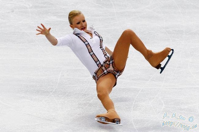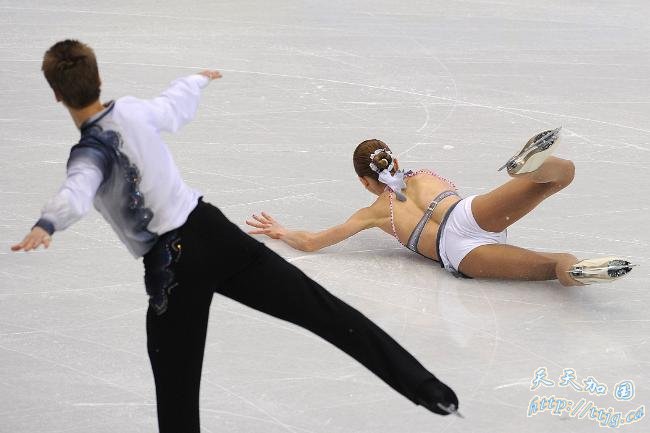 在花样滑冰双人滑比赛中,波兰女选手乔安娜·苏勒杰摔倒在地。