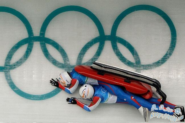 来自俄罗斯的两位选手弗拉季斯拉夫·乌扎可夫(右),和弗拉季梅尔·马齐努提恩,在男子双人雪橇训练场上摔倒的瞬间。