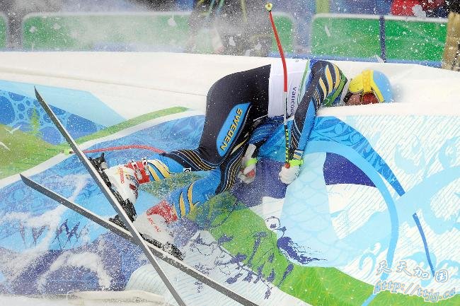 瑞典37岁老将帕提克·贾雅本,在速降滑雪赛中摔倒在场地周围的安全护墙上。