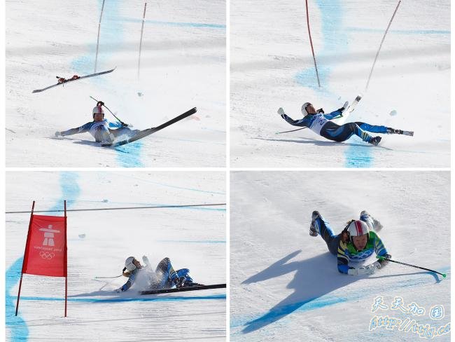 本图中的四个小图,是瑞典选手安贾·佩尔森在此次冬奥会上参加女子速降滑雪赛中摔跤的集锦。