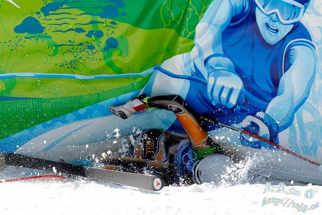 来自智利的选手诺埃勒·巴拉奥纳摔在安全围墙上。围墙上巨大的滑雪者图象恰巧位于他的正上方。