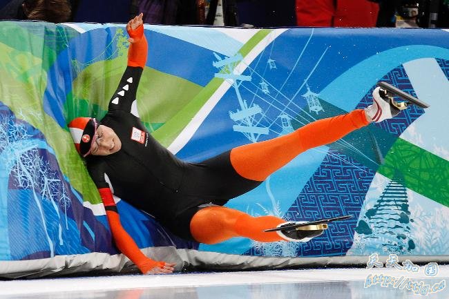 荷兰选手安妮特·格丽特森在速度滑冰女子500米预赛第一轮中摔倒,头部撞在场地的安全围墙上。