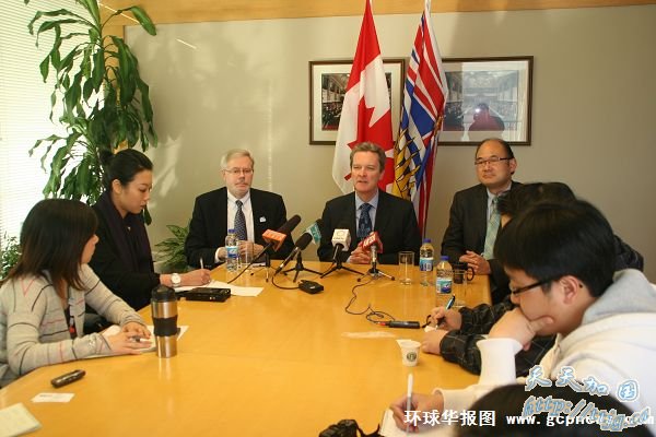 上图:卑诗省财政厅长韩仕新(中)召开华文传媒圆桌会议,再次力陈统一销售税(HST)对卑诗经济的好处。 黄运荣 摄