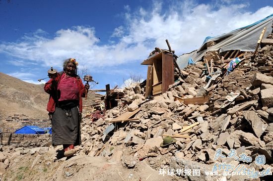 4月19日,一名藏族妇女在自家废墟上点亮酥油灯,为劫后余生的人们祈福。