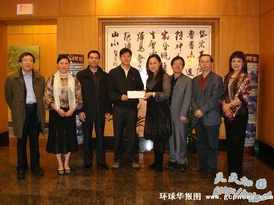 请总领馆接受我的微薄心意,替我转交12,000 加元为灾后重建玉树卫生专科学校尽一分力,表达我们华人饮水思源感谢祖籍国,困难时刻与祖籍国受灾民众的心在一起,共度时艰。我默默宣誓,用行动参与到胡主席心系灾民(出访中途赶回国)和参与到温总理动员“有一线希望,尽百倍努力,决不放弃”的抗震救灾行列之中。