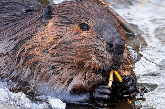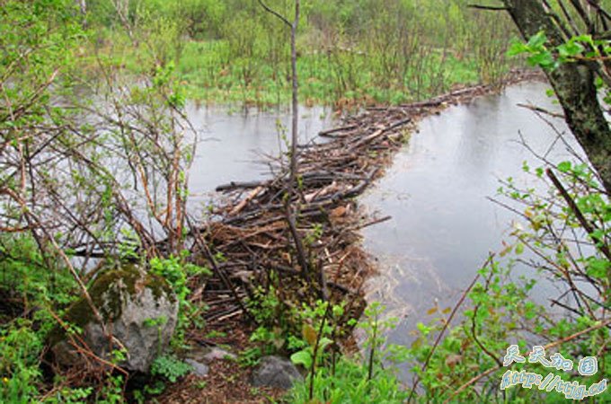 河狸是一种长着大牙的毛绒绒的动物,它们喜欢用木头、泥土和石头修建水坝,圈出一条“护城河”来保卫家园。河狸家庭都住在水坝上的巢穴里,全家每天不停地对水坝进行加固和扩建。通常河狸的水坝长度约为460米,伍德布法罗国家公园的这一座大概是几个河狸家庭合作修建的。