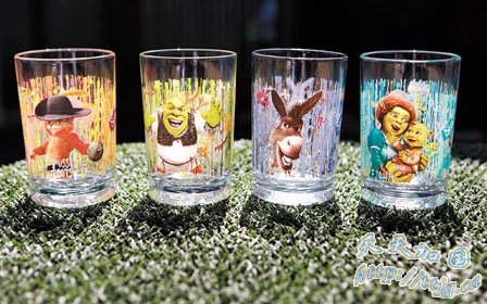 这4款水杯的推出,是為配合电影《史莱克万岁万万岁》(Shrek Forever After)宣传,4款玻璃杯分別印有史莱克、Princess Fiona、Puss in Boots及Donkey的卡通形象。