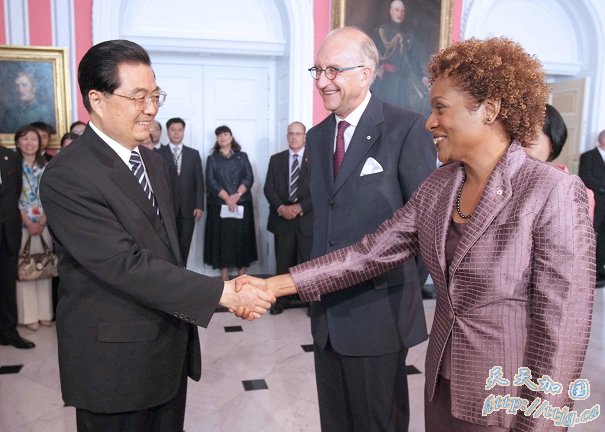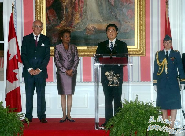 6月24日,中国国家主席胡锦涛在渥太华出席加拿大总督庄美楷为他到访举行的欢迎仪式。 新华社