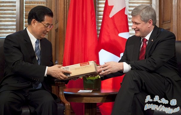 加拿大总理哈珀向中国国家主席胡锦涛赠送魁北克出产的枫叶糖浆。 加拿大总理哈珀与中...