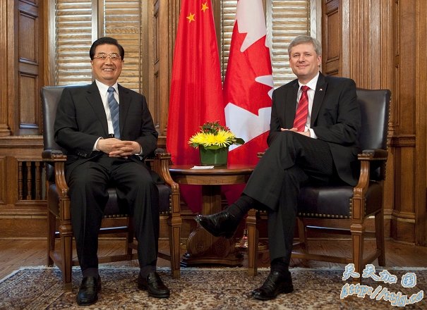 加拿大总理哈珀与中国国家主席胡锦涛举行双边会谈,相谈甚欢。