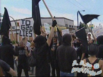 抗议G20高峰会的团体Black Bloc,26日上街示威时向警方挑衅,所幸並未升温成暴力事件。(Global TV) 26日在多伦多上街抗议G20高峰会的民眾与警方发生暴力衝突