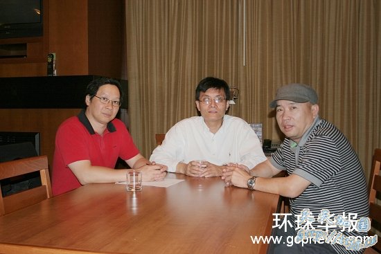 赖昌星日前在一家酒店内接受《环球华报》专访。左起为黄运荣、丁果、赖昌星。