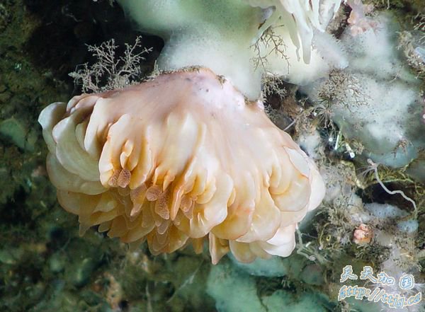 3、美丽的单体杯状珊瑚:ROPOS摄像机通过高清镜头拍下了这朵像牡丹一样的单体杯状珊瑚。路易斯安那州立大学专家介绍,杯状珊瑚在北美太平洋海域非常常见,但这次发现的单体杯状珊瑚是一个新物种。