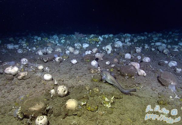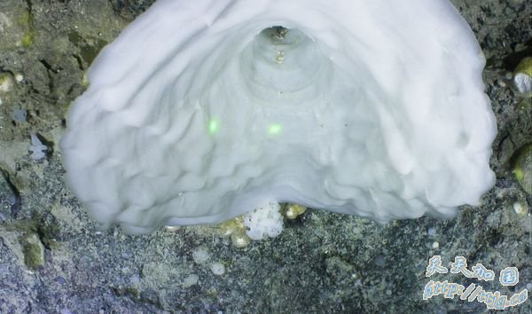 8、白色海绵遍布整个海床:这种白色海绵属于钵体海绵科。这是ROPOS潜水器摄像机在最后一次下潜至1200米深时拍到的。
