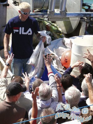 三文鱼的零售价,明显下调三至四成,冰鲜的每磅售4元,新鲜的则25元至30元一条。记者现场所见,每条渔船旁都有50人以上排队,一艘船在数小时内就售光上千条三文鱼。有消费者更有备而来,带同大型保温冰桶,来装购得的三文鱼。除了三文鱼之外,华裔买家尤其钟情肥美的海胆。