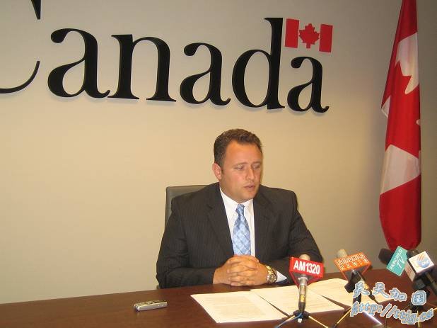 加拿大联邦小生意及旅游事务国务部长穆尔(Rob Moore)在记者会上 熊文 摄
