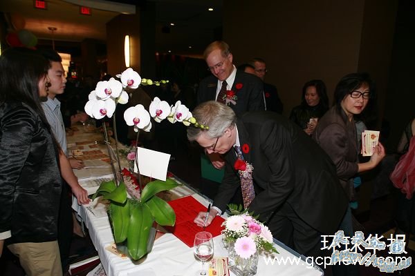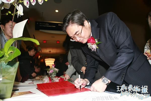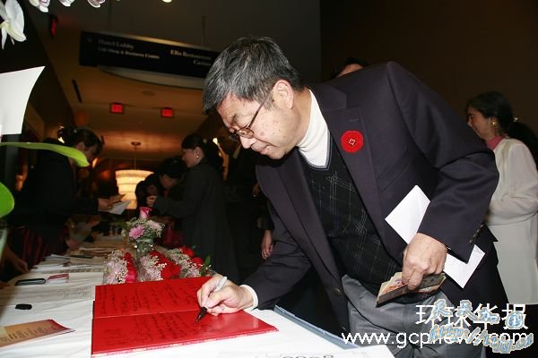 中国驻温总领事梁梳根在贵宾留言本上签名。